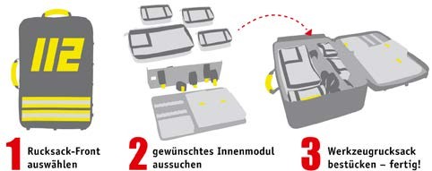 Das Sortiment bietet zudem spezifische Innenmodule für verschiedene Werkzeugsätze, die nach Bedarf ausgewählt werden können. Ein Beispiel ist das Innenmodul für Handwerkzeuge, das aus mehreren Werkzeugboards mit Taschen und Halteschlaufen, verschiedenen Rolltaschen für Schraubendreher und Gabel-/Ringschlüssel sowie einer Trennwand besteht. Das Innenmodul für Türöffnungswerkzeuge umfasst ein Werkzeugboard mit Taschen und Halteschlaufen, fünf verschiedene Innentaschen sowie eine Trennwand mit zusätzlichen Schlaufen. Dank der übersichtlichen Aufteilung in verschiedene